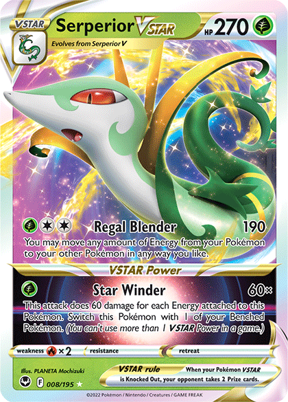 - Regal Blender: Sẽ gây 190 sát thương và cần dùng 1 thẻ năng lượng Cỏ và 2 thẻ năng lượng bất kỳ. Ngoài ra chiêu thức này sẽ có một khả năng là chọn 1 thẻ năng lượng và gán vào 1 Pokemon bất kì và có thể thay thế Serperior Vstar bằng 1 Pokemon khác.